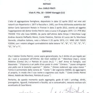 Come il citato Girolamo di Raffaello che aggregò Raffaello nato Orsetti, in data 2 aprile 2012 con atto pubblico il marchese Luigi del fu Gerardo Mansi, conte palatino, patrizio di Lucca, nato a Milano nel 1973 ha aggregato alla propria Casa il dottor Emilio Petrini nato a Lucca nel 1975 con il diritto di uso legale per sé, i suoi e successori all’infinito dei titoli nobiliari, dell’ Arma di Famiglia e del cognome MANSI, da aggiungere al proprio, in modo che il suo nome e cognome così risulti: “Conte Emilio Petrini Mansi, Nobile dei Marchesi, Patrizio di Lucca”; Pertanto, quale aggregato gode di tutti i privilegi, diritti, prerogative, riguardi, trattamenti e facoltà, usi e consuetudini, nessuno escluso e/o eccettuato di Casa Mansi, diritti che al Conte Emilio Petrini Mansi sono stati legalmente riconosciuti anche negli atti civili e religiosi.
